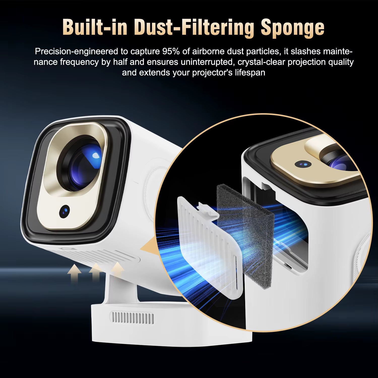 Semi-sealed design and dust-filter sponge cut maintenance in half and keep images clear longer. Low-noise cooling means quieter movie nights and clearer audio from the built-in speakers. The compact, lightweight body and rotating stand make it easy to share in the living room, patio, or while traveling.